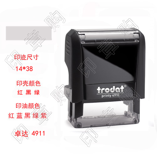 品牌:卓达规格:38 x 14mm优势:轻松盖印,印迹清晰,干净整洁,100,000次以上盖印寿命1. 使用方便——连续盖印,1次完成2. 印迹清晰——高精度,15年不退色3. 内置印台——方便注油;可更换印台4. 全景视窗——提高效率5. 精确盖印定位对准设计,防滑设计